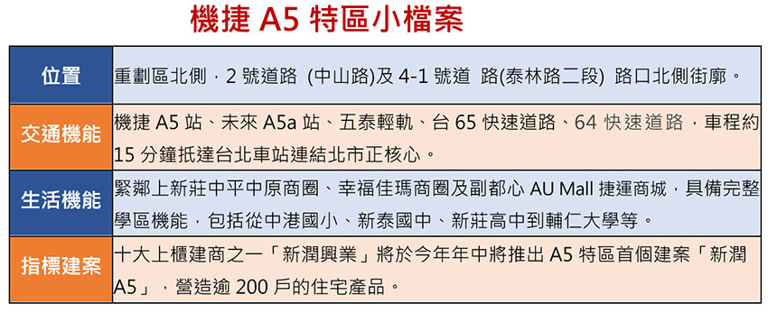 機捷A5特區鄰近新莊副都心、新板特區,以住宅與商業用地做為開發主軸。因與中平商圈僅隔著一條泰林路相望,新城區與舊商圈的巧妙結合,恰好符合現代城市都心擴大法則。區域除了重要交通建設機場捷運A5站、五泰輕軌A5a站之外,周邊緊鄰可迅速連結國道一號的台65快速道路、串聯國道三號的64快速道路,以及連結台北車站的台一線,往返雙北輕鬆寫意,由於匯聚北台灣各大重要路網,加上鄰近五股、泰山、新莊副都心等新興重劃大城,也成為發展都市門戶與交通轉運的重要樞紐。